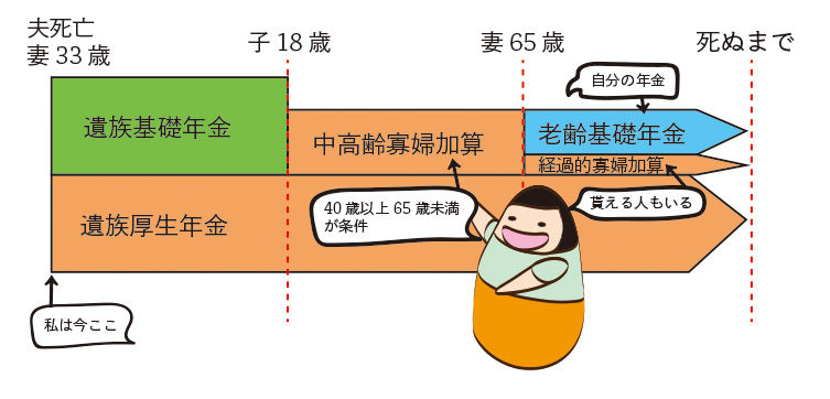 子が18歳を過ぎて遺族基礎年金がなくなっても、40歳〜65歳の間は中高齢寡婦加算がある。